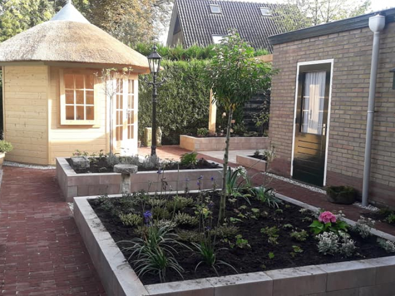 De achtertuin met keramische tegels gecombineerd met gebakken klinkers en een nieuw buitenverblijf rietgedekt.